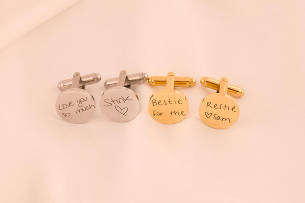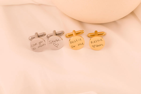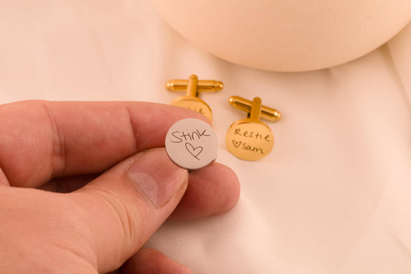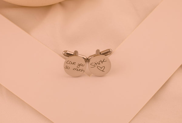 Capture your love in the most personal way with these custom handwriting cufflinks, engraved in sleek stainless steel with your actual message. Whether it's âLove you so muchâ or a secret nickname, these cuff links transform words into wearable emotion â a timeless keepsake for lifeâs most meaningful moments. Handcrafted with precision, these round cufflinks are the perfect blend of sentimental and stylish â ideal for grooms, anniversaries, or heartfelt gifts. Surprise your partner with a love note theyâll wear proudly, whether itâs for your wedding day or a just-because gesture that leaves a lasting impression. ⨠Perfect for: Weddings, Anniversaries, Fatherâs Day, Groom Gifts đ Gift-ready packaging included đ Fast, secure shipping đż Hypoallergenic stainless steel â tarnish-free and durable đď¸ Your handwriting engraved exactly as submitted This is more than jewelry. Itâs a memory made permanent.