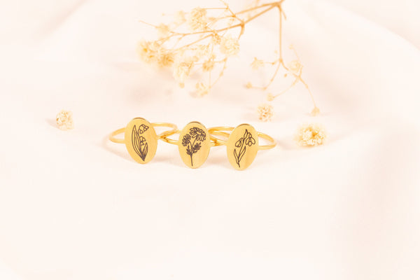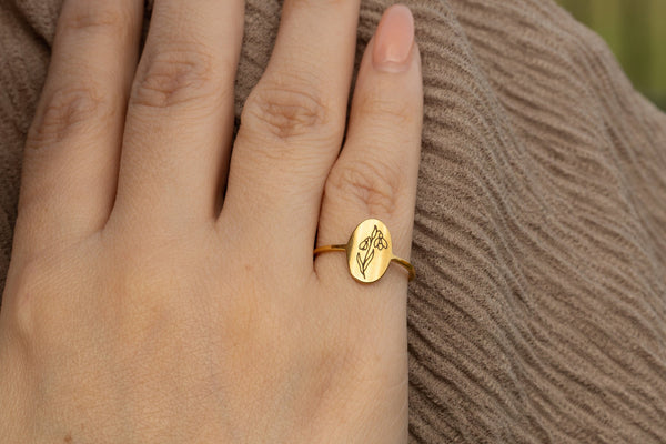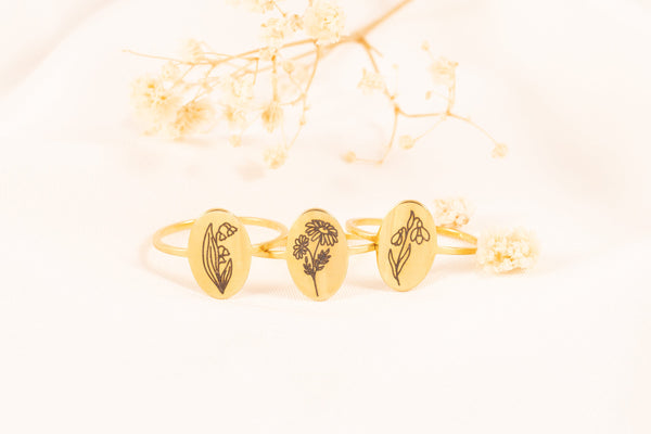 Birth Flower Ring - Birthday Floral Gold Signet Ring - Stacking Minimalist Ring - Birthday Gift - August Birth Month Flower