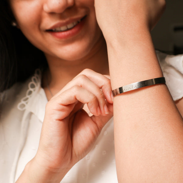 • The bracelet measures 6 inches x 1/4 inch and can be gently squeezed or pulled open to make slight adjustments for your wrist.
