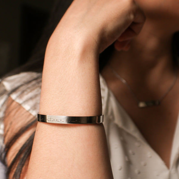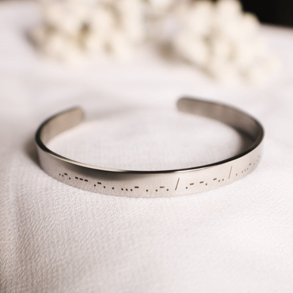 Send a wearable secret message to a friend or loved one with this unique Morse code stamped bracelet! This bracelet is engraved with the morse code message of your choice. We will convert the message into morse code. It can fit a MAXIMUM of 30 characters (that includes spaces). So shorter messages are best.