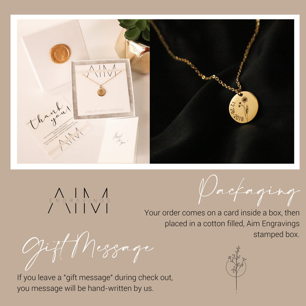 • Jewelry comes on a card inside a box, then placed in a cotton filled, Aim Engravings stamped box.
