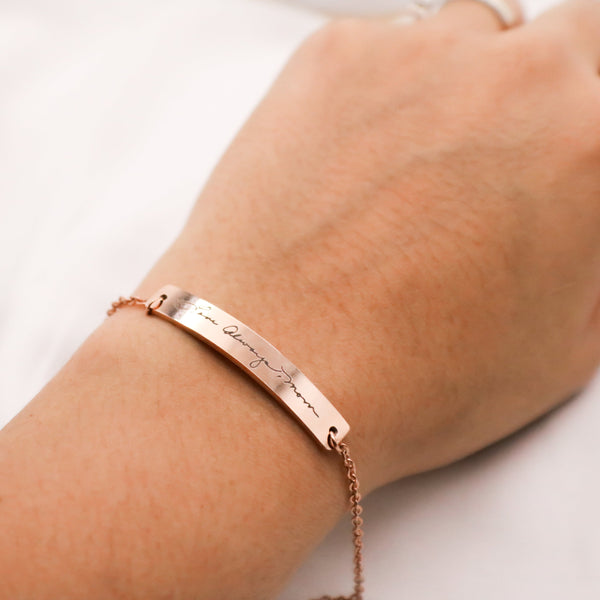 This handmade bracelet is the perfect way to keep a loved one close. Crafted with a custom signature or writing, this bracelet makes a meaningful and timeless gift. Featuring intricate designs and a unique personal touch, it's the perfect way to commemorate special occasions or keep a loved one in your heart.