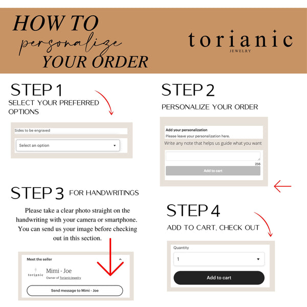 Please take a clear photo straight on the handwriting with your camera or smartphone. You can send us your image after checking out in a message. If you don't want a handwriting, please pick your font on picture 8 Leave a brief description below .