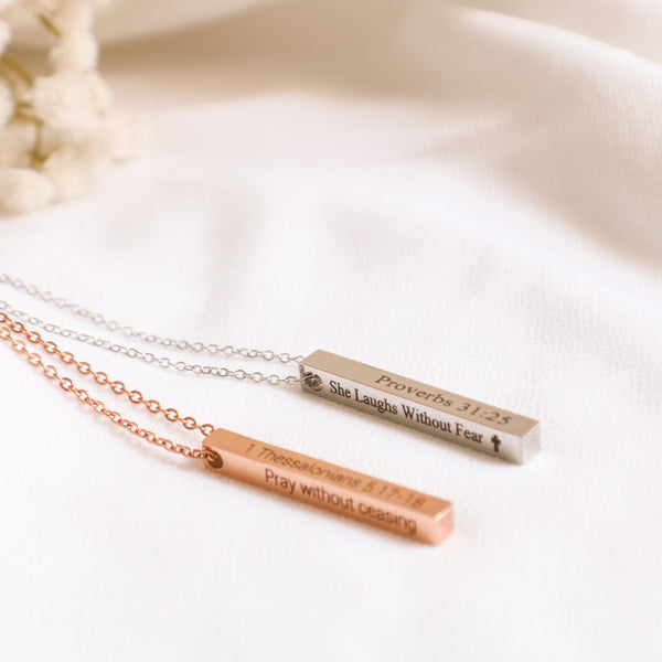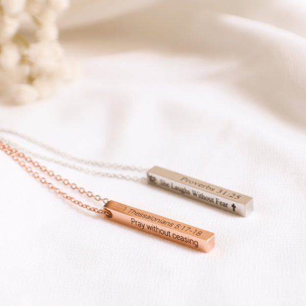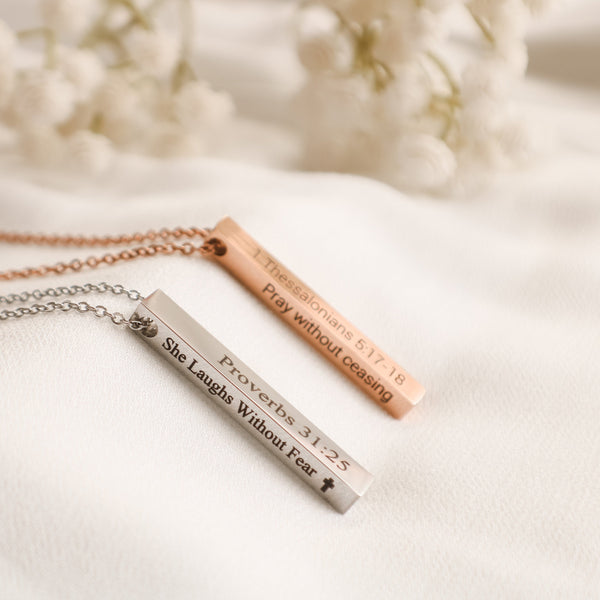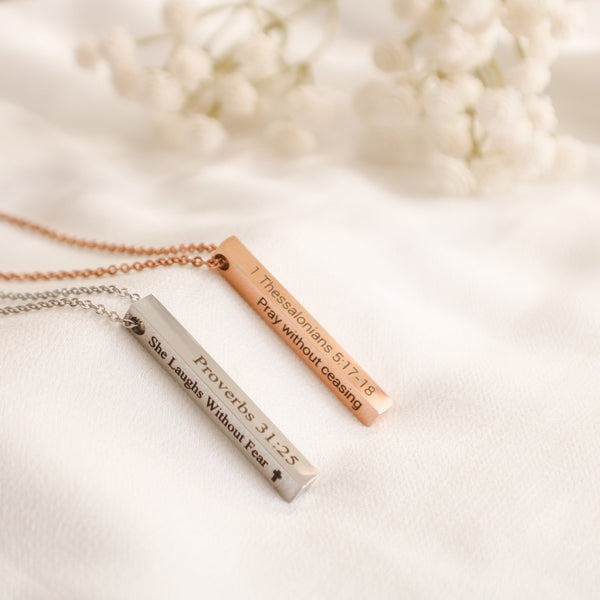 Inspire faith and devotion with this beautiful Bible Verse Necklace. The custom vertical bar pendant is inscribed with scripture, making it a perfect Christian necklace and jewelry piece to be passed down from generation to generation. With its classic design and meaningful message, this is the perfect way to keep your faith close to your heart.