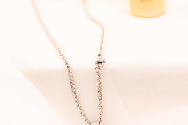 • Mirror polished stainless steel • Pendant measures 1 3/8" x 1" • 2mm Stainless Steel Box Chain, 18K Gold Plated