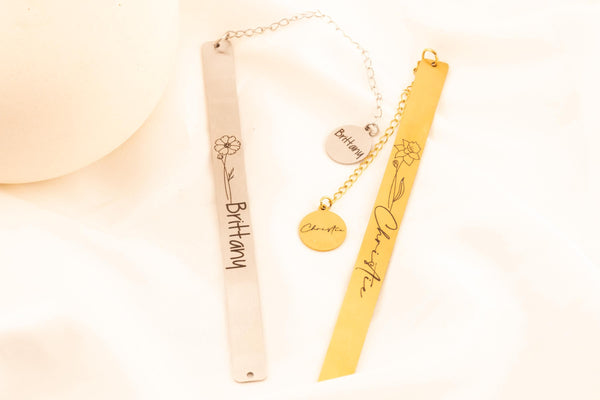 Turn every page into a moment of beauty with this personalized birth flower name bookmark, elegantly engraved on a premium metal page marker. Each piece blends floral artistry with meaningful personalization, making it a keepsake that readers will treasure for years. Your chosen name is etched in graceful script alongside the unique birth month flower, symbolizing individuality and style. Crafted with smooth edges and a luxurious finish, this bookmark is both a practical reading tool and a heartfelt gift. Why You’ll Love It: Personalized with your name and birth month flower Premium metal for durability and elegance Engraved details for a lasting keepsake Smooth page-safe edges Perfect For: Birthdays, graduations, Mother’s Day, teacher appreciation Gifts for book lovers, writers, and book club members Romantic gestures for the reader you love Beautifully packaged and ready to gift, with fast shipping and artisan-level craftsmanship you can trust.