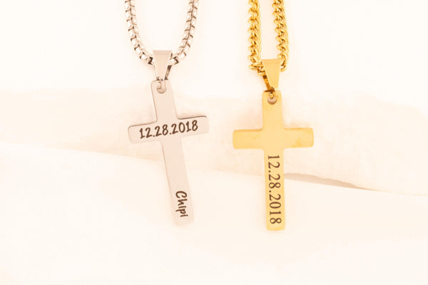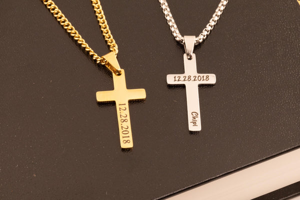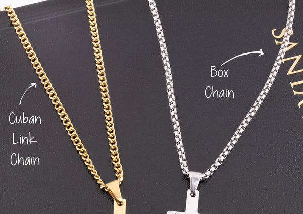 Details: ⢠High polished stainless steel, silver and gold ⢠Cross measures 32mm x 17mm ⢠3mm Stainless Steel Chain, 14",16",18", 20"