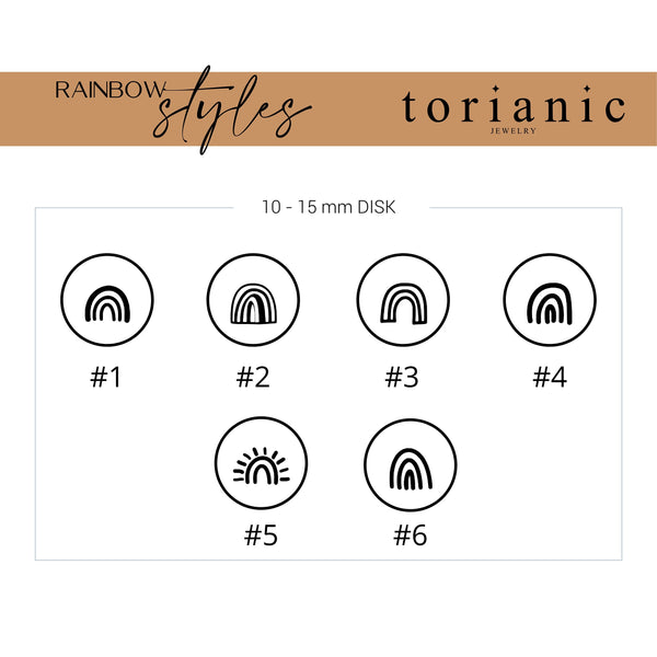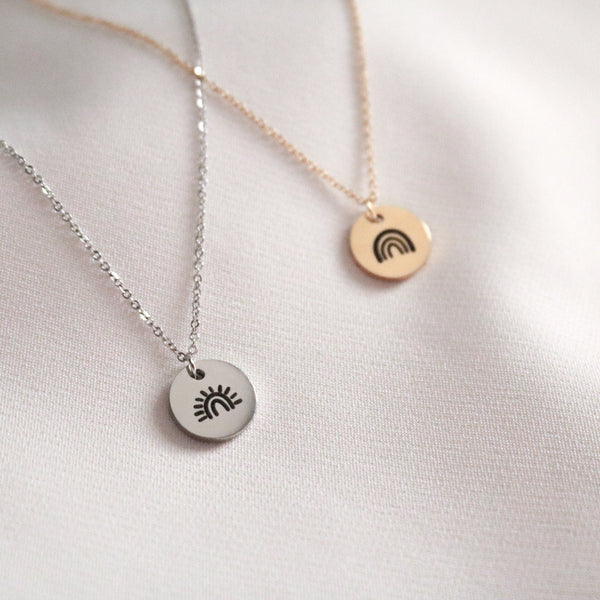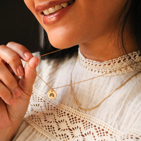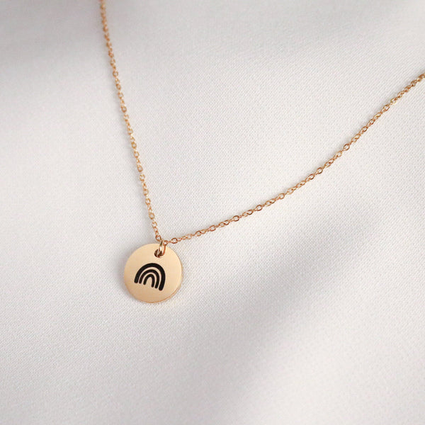 Rainbow Disc Necklace. Featuring a thoughtfully hand drawn arch, our new Rainbow necklace delicately represents so many things that we hold dear: finding joy after loss, the crossover to new beginnings, and the beauty of diversity.