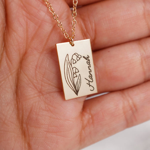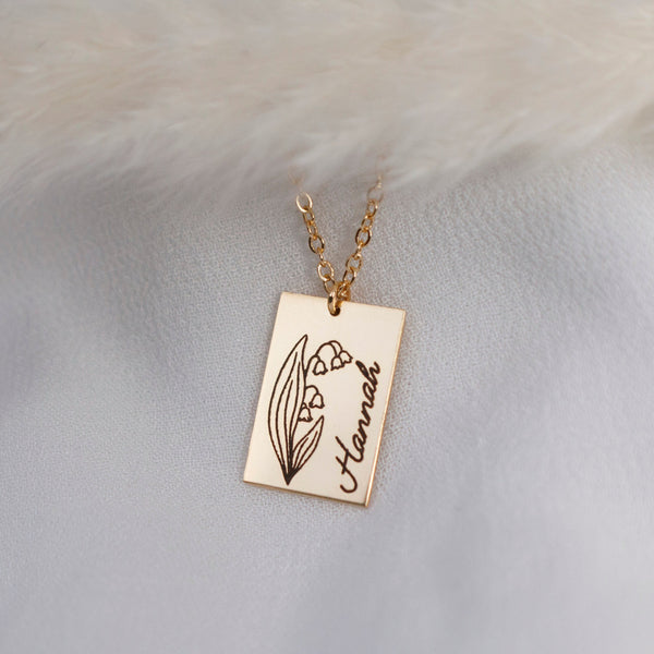 This custom birth month flower name necklace is perfect for special occasions such as bridesmaid gifts, best friend birthdays, and mother's day presents. Crafted with gold-filled or sterling silver, it is sure to become a cherished memento. Personalize it with your chosen flower and name for a truly unique keepsake.