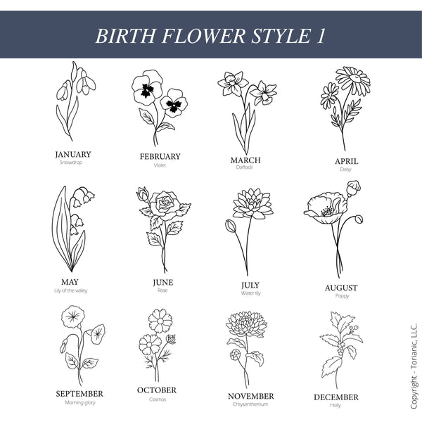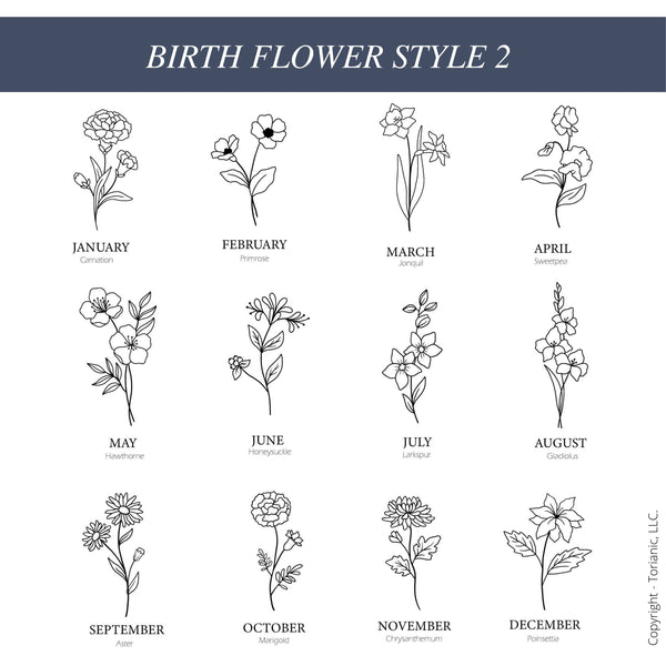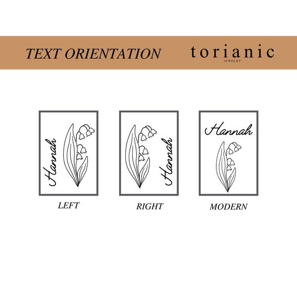 Front: Birth flower style 1: MAY (Lily of the valley) Hannah (font #11, Text Orientation: Right) (Please see pic 9)